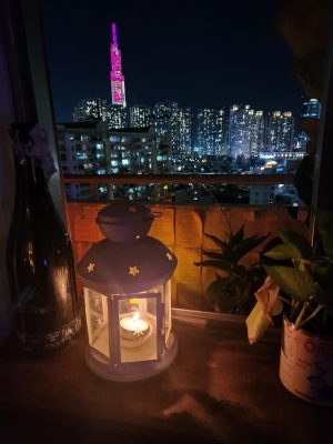 Bước vào căn phòng, tôi đã bị đi từ ngạc nhiên này đến ngạc nhiên. Đó là một căn phòng huyền bí với một kiểu trang trí vô cùng độc đáo. Chiếc rèm cửa màu kem style kiểu Nhật, được cắt dọc và vẽ tay với hình ly rượu và logo 2cms. Mỗi góc sẽ có một chiếc bàn với kiểu dáng khác nhau, 2 phòng thông suốt và 1 quầy bar. Ở giữa không gian phòng khách có một nơi để máy phát nhạc, và điều đặc biệt nhất của 2cms đó từ trong phòng khách bạn có thể phóng tầm mắt nhìn ra toàn thành phố. Tòa nhà landmark, biểu tượng của Sài Gòn với những gam màu rực rỡ đang lấp lánh trước mắt tôi thật đẹp. Đó là 2 khung cảnh hoàn toàn đối lập: bên ngoài là sự hiện đại và náo nhiệt của Sài Gòn và bên trong quán bar này thì là sự bình yên và cổ điển. Chẳng cần điều hòa, vì gió từ bên ngoài thổi vào trong tận phòng khách có thể khiến tóc bạn bay phấp phới. Bạn có thể đứng hoặc ngồi ngoài hành lang, tay cầm ly rượu và ngắm nhìn mà không cần làm gì cả có thể đủ xua tan đi những cảm giác mệt mỏi cả ngày.